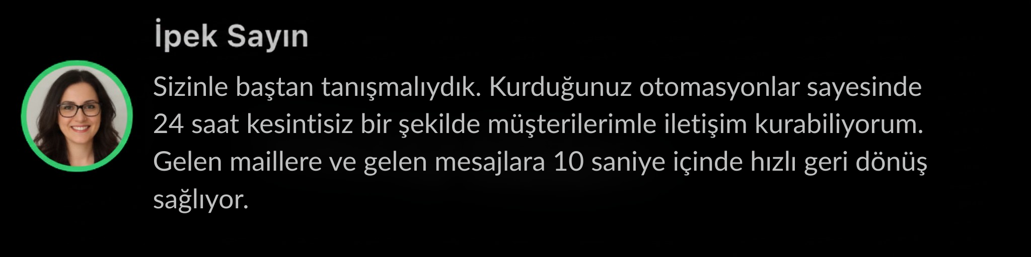 Bizim yapay zekâ otomasyonlarımız sayesinde satış, müşteri hizmetleri, e-mail, raporlama ve operasyonel tüm süreçler 7/24 hatasız çalışır.